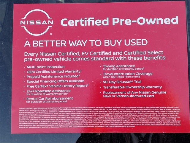* 7 Year/100,000 Mile Limited Warranty, 24/7 Hour Roadside Assistance, Carfax Vehicle History Report, Plus 1 Year Pre-Paid Maintenance Included. Gas Powered Nissan Models Only.